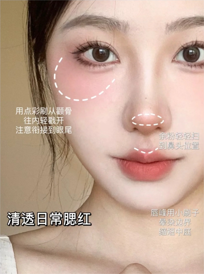 以前我刚学化妆的时候腮红总是画的脏兮兮的,本来凹陷的面中涂完腮红反而更凹陷了,后来终于通透啦!