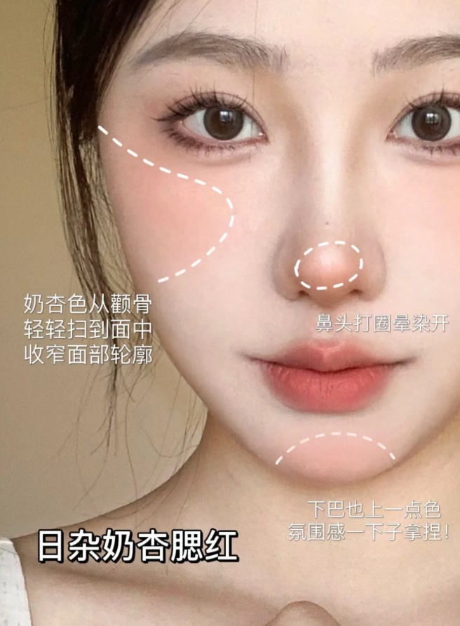 4、日杂奶杏(面中提拉)腮红:把苹果肌视觉上向上移,适合圓脸姐妹和短脸姐妹,提拉面中和改善脸型